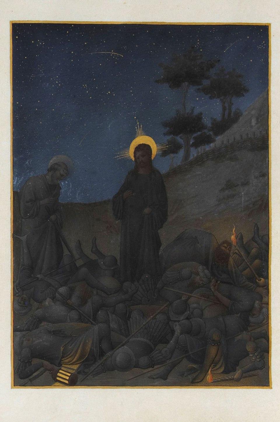 בפעם הראשונה שמצוירת סצנה לילית – איור מעצרו של ישו, המתוארת בפרק 18 של הבשורה על פי יוחנן. ישו על הר הזיתים, מלווה בסן פייר, כשרק כמה אורות מבליחים. החיילים הרומאים שבאו לעוצרו, מוטלים על הארץ, שלושה מהם אוחזים עדיין לפידים מושלכים, גוועים. אך האור המרכזי קורן מההילה של ישו, שממנה בוקעים שלושה זרי אור מנצחים, חיצים לעבר הרקיע, המנוקד בהרבה כוכבים עגולים ושני הבזקי אור קוויים.